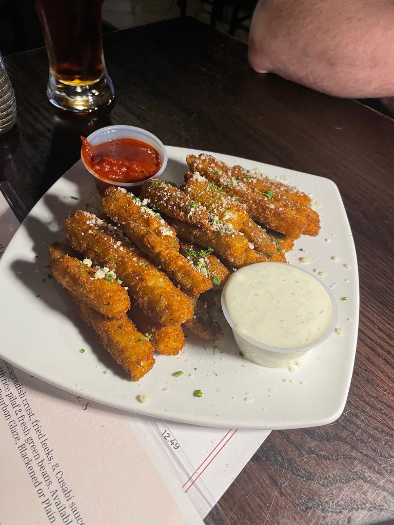 He got the fried zucchini for his app and the maple bacon chicken sandwich for the meal with green beans as a side.