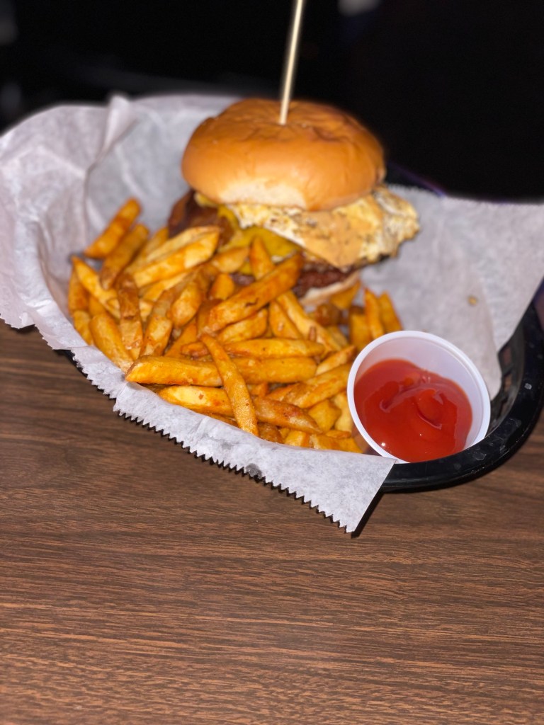 Ted got the breakfast burger, which has a fried egg on it, along with peanut butter and strawberry jam. To which Shane commented for the second time in two weeks “there’s a lot going on there.” But it came highly recommended by the server, so that was enough to win Ted over.