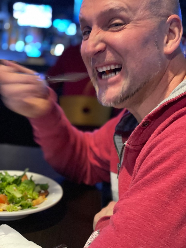 He was very happy with his choice though. He said the sauce was tasty and the entire dish was overall very flavorful and good. And that included the salad – as evidenced by this picture showing physical evidence of him eating a salad and looking super happy about it. Ha.