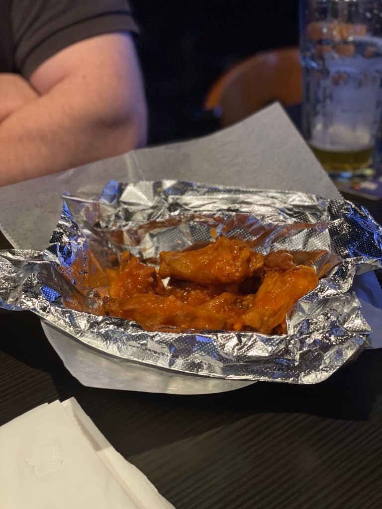 Because all meat must come with a side of meat in this group, he also got six of the hot garlic Parmesan wings, minus the Parmesan – because, well, Ted.