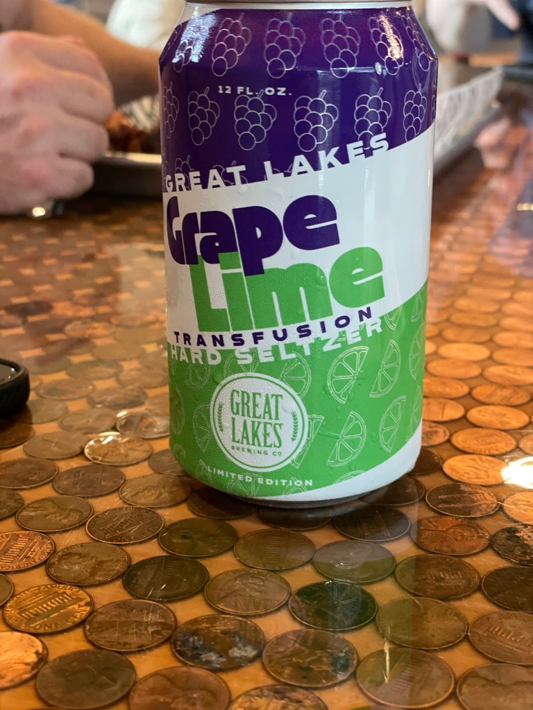 Shane – who has sworn off beer for what he says is forever but let’s be honest is at least for this week anyway – got a grape lime seltzer from Great Lakes Brewery.