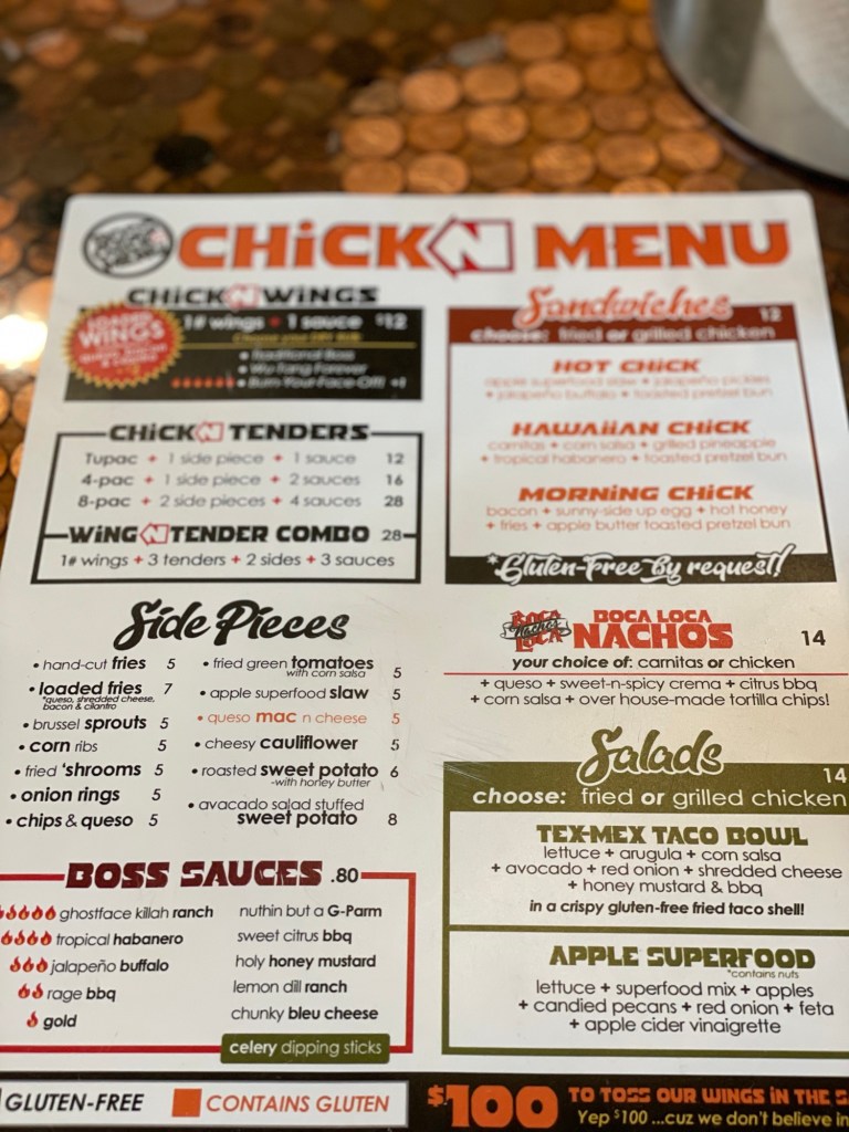 So the menu here is pretty limited. I mean let’s just say the name of the place is pretty accurate. So if you don’t like chicken – in one form or another – or beer/drinks – in one form or another – well, this may not be the place for you and you really can’t fault anyone but yourself for not realizing that.