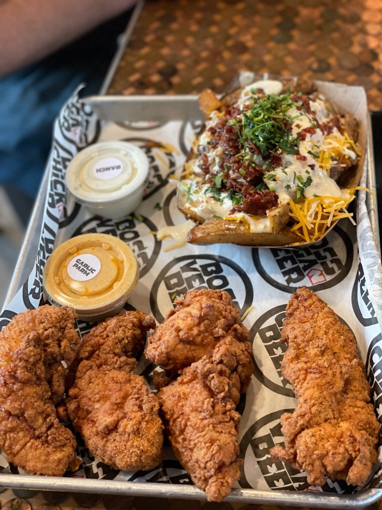 Shane got the four pack, which is four pieces of chicken, two sauces and one side. In a move that should surprise no one, Shane asked which side would give him the most for your money, then landed on the loaded fries. For sauces he got the lemon dill ranch and then “nuthin but the G-parm.”