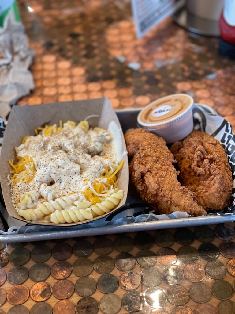 For meals I went with the “Tupac,” which is two chicken tenders and comes with a side and a sauce. I chose the Gold, which was the lowest on the heat scale.
