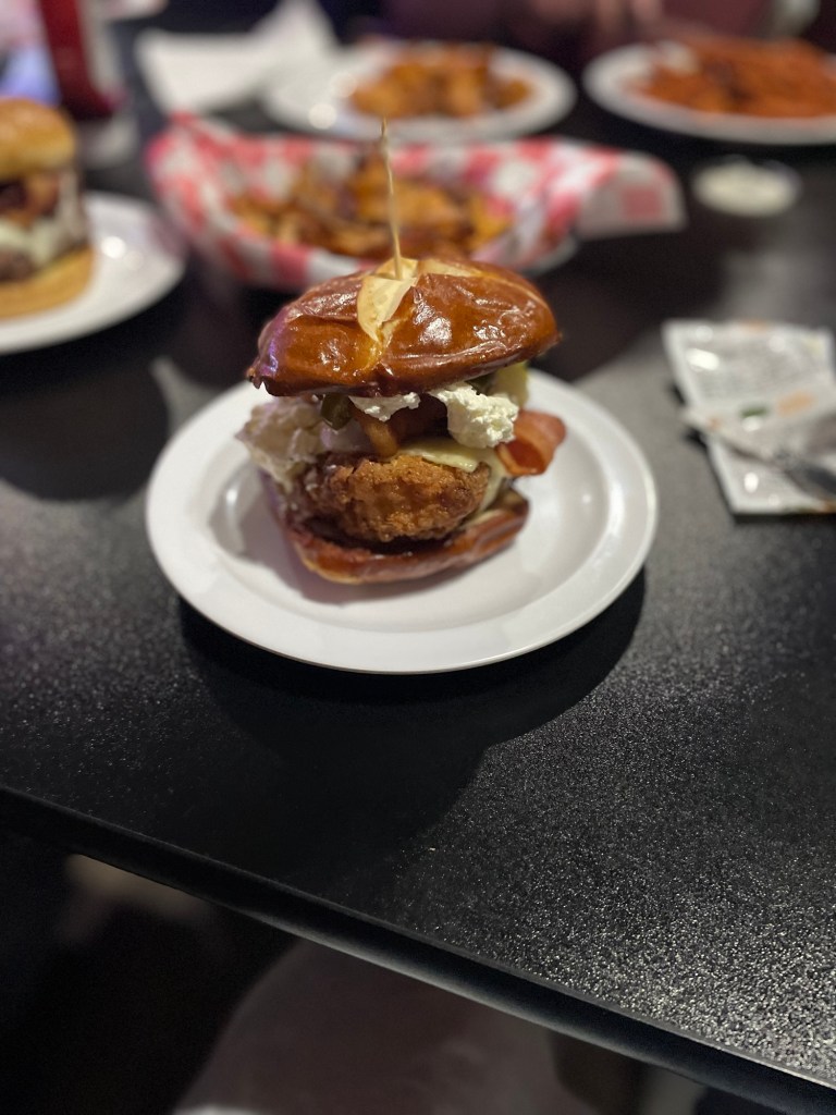 I got the chicken popper sandwich, which is fried chicken with jalapeños and cream cheese on a pretzel bun.