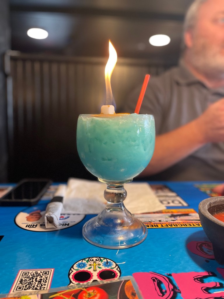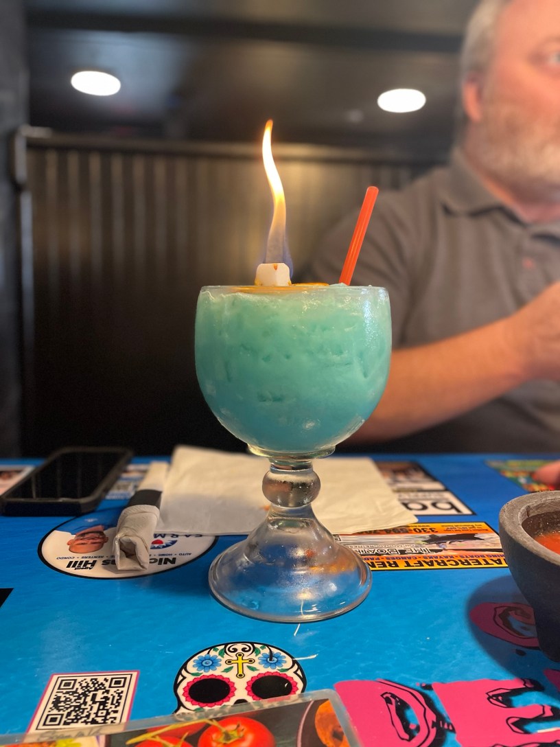 This is the Flaming del Lago from the specials menu, and Ted’s reasoning for ordering it was that, well, it’s not often you have the chance to have a drink that’s literally on fire. Fair enough.