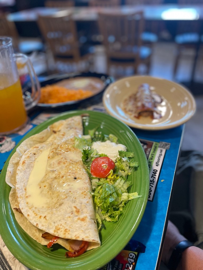 Shane was intrigued with my order and almost switched up, but when he asked our server how large the burrito was he didn’t like the hand sizing he received as a response. So he got the fajita quesadilla instead. And a side of beef enchilada. Because why not.