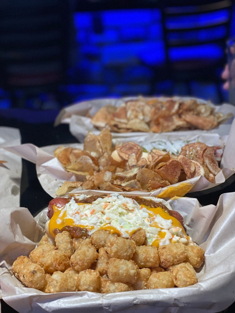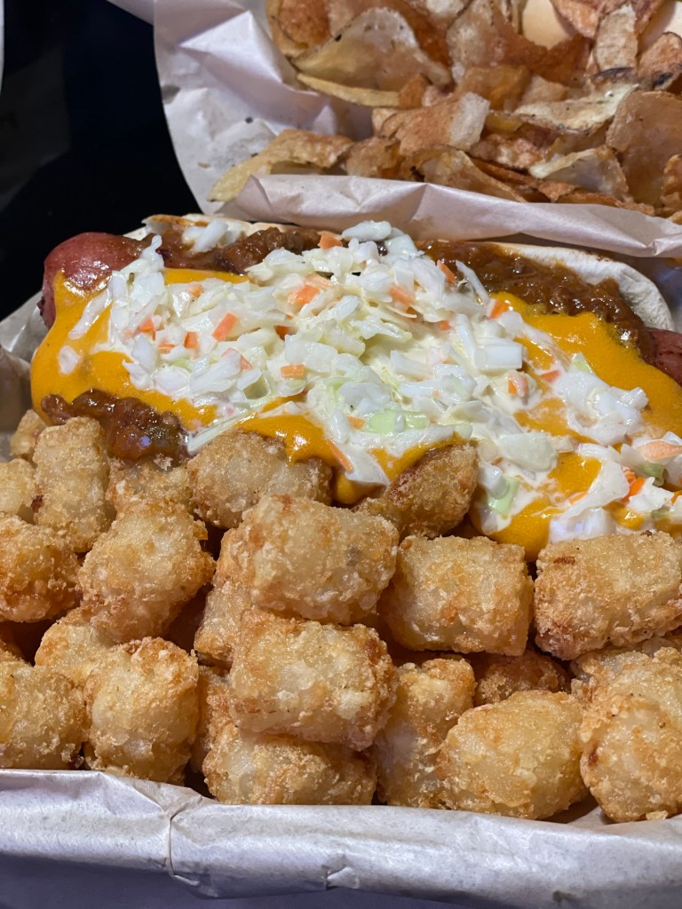 Now that left a lot of chips and tots untouched, but the three dogs were all finished by the end of the meal. He started with the original and then moved to the chili and saved the slaw for last. Which he said in retrospect was a good move because the slaw dog was the most filling and so he was glad he didn’t start with that one.