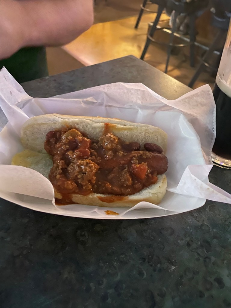 Speaking of things we didn’t see on the menu when we originally ordered … Shane had his full meal in front of him on the table when he learned that they also have hot dogs and chili dogs. And because not only did he not just have a literal table full of them a mere few weeks ago but also we like to shock our servers in just how gluttonous we can be, of course he and Ted each had to order one.