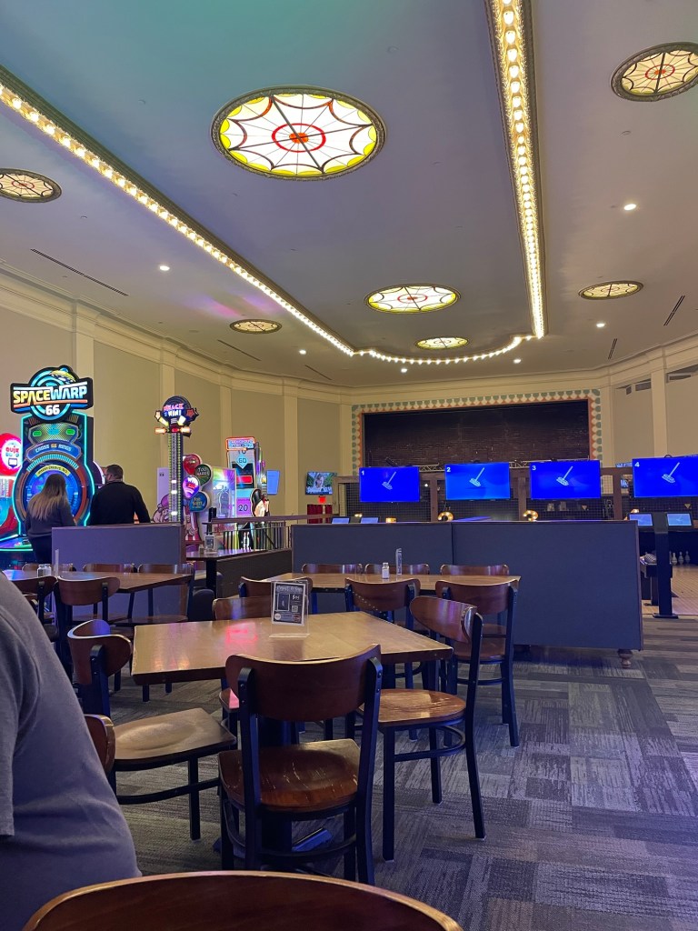 So first off, the layout of the space is, well, odd. Like I get the idea – put the games near the tables so that if you brought the kids you can watch them play while you have drinks and food. But if you aren’t a family or youth sports team and are just three friends out for dinner and maybe watching a game then it’s kind of like putting a table smack in the middle of the slot machine room at a casino given the noise level and the bright lights.