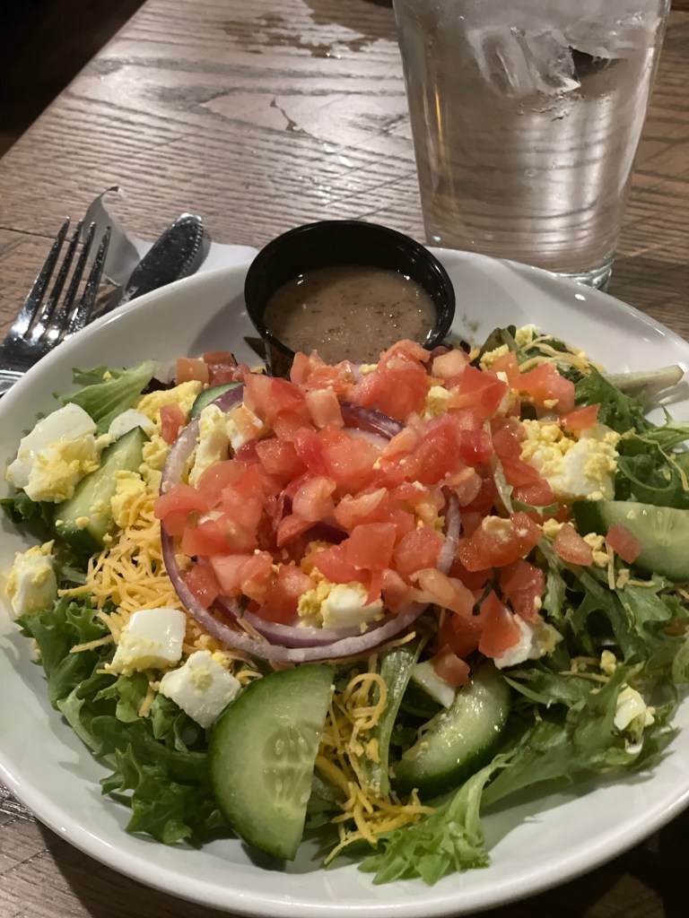 It comes with fries but I opted for the side salad for an upcharge. Remember we’re being healthier here.