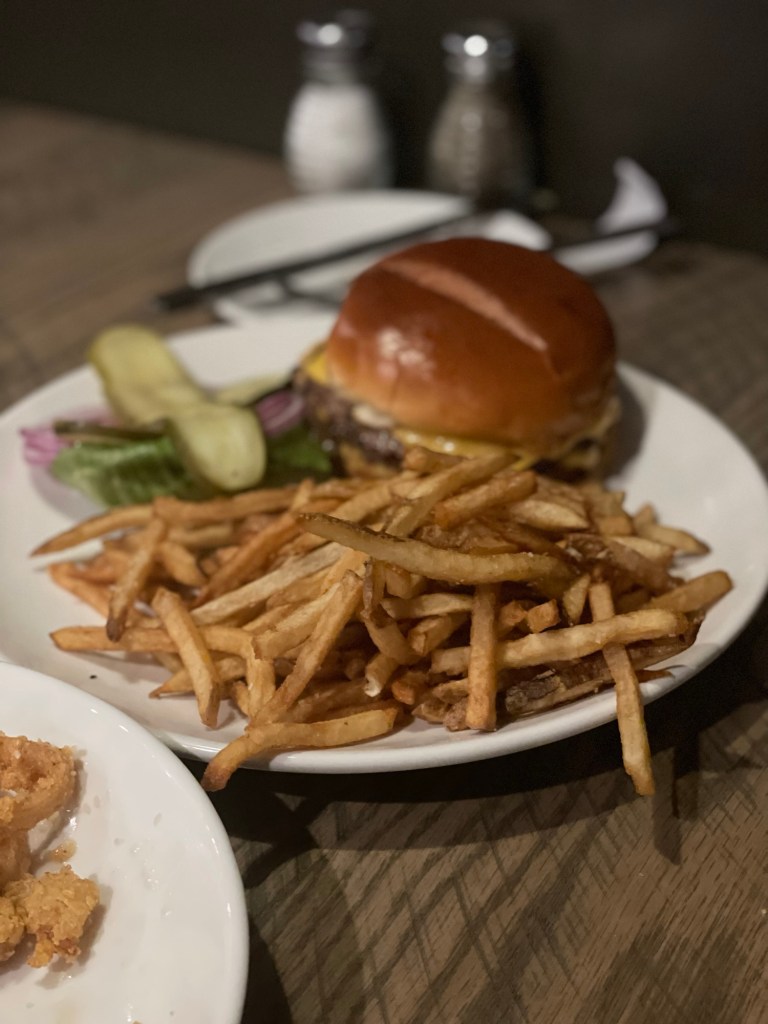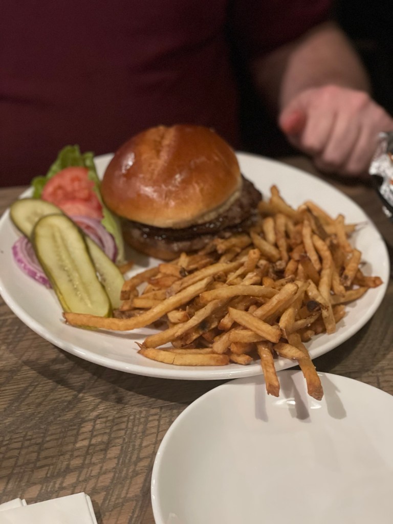 The guys both liked their burgers. Partially because they somehow managed to order the same thing but have two burgers arrive at the table done to the temperature that each of them prefers without ever uttering a word about how they like their burgess cooked. Shane’s burger arrived with patties that were pink in the middle, just how he prefers them. Meanwhile Ted’s were a bit more well done, which is his preference.