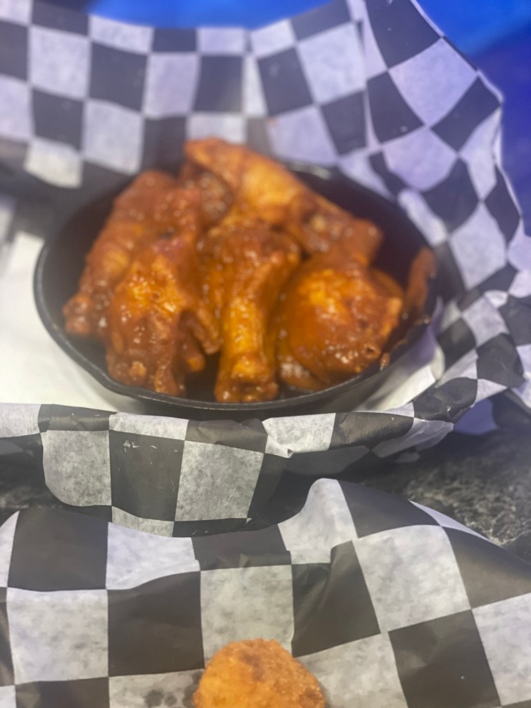 Ted got the cowboy burger. He’s also staying on theme so far in 2026 by also getting wings, too – because, in what should be our slogan, “we like burgers and wings.” He got five of the firecracker wings, which is their special house blend.